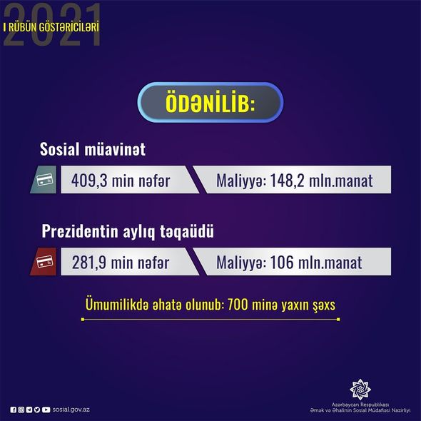Nazirlikdən bildirilib ki, onlardan 409,3 min nəfər (o cümlədən, 386,6 min nəfər aylıq, 22,7 min nəfər birdəfəlik) sosial müavinətlə, 281,9 min nəfər isə Prezidentin aylıq təqaüdləri ilə təmin olunub.