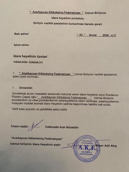 “Azərbaycan Kikboksinq Federasiyasının İdarə Heyəti AKF-nin Prezidentini və Vitse-Prezidentlərini istefaya göndərdi”.