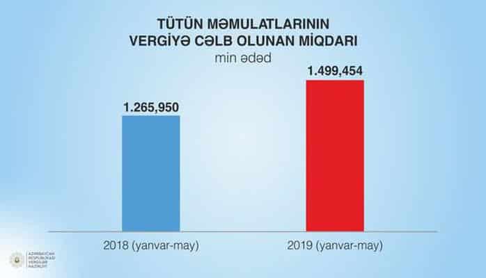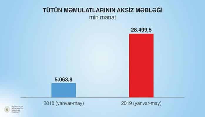 Cari ilin beş ayında ötən ilin beş ayı ilə müqayisədə tütün məmulatlarının istehsalçıları üzrə tütün məmulatlarının vergiyə cəlb olunan miqdarı 18,4 faiz, aksiz məbləği 5,6 dəfə, tütün məmulatlarının istehsalçıları üzrə dövriyyə isə 3,7 dəfə artıb.