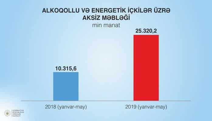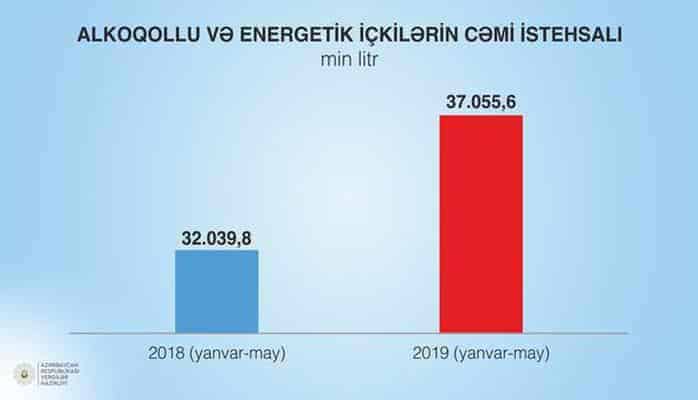 2019-cu ilin yanvar-may aylarında alkoqollu məhsullar və enerji içkilərinin istehsalı (aksiz vergisinə cəlb olunan istehsal həcmi) ötən ilin müvafiq dövrü ilə müqayisədə 15,7 faiz, aksiz məbləği 2,5 dəfə, alkoqollu içkilərin istehsalçılarının dövriyyəsi isə 1,6 dəfə artıb.
