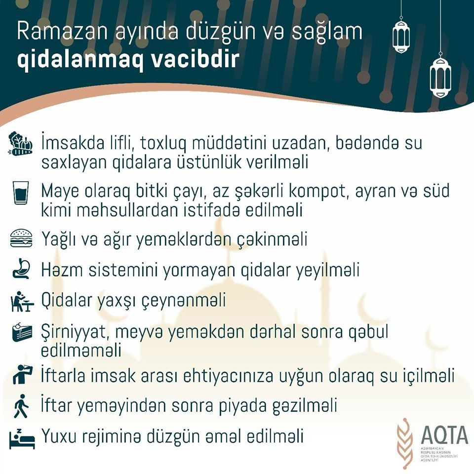 Azərbaycan Qida Təhlükəsizliyi Agentliyi (AQTA) Ramazan ayında düzgün qidalanma ilə bağlı məlumat paylaşıb.