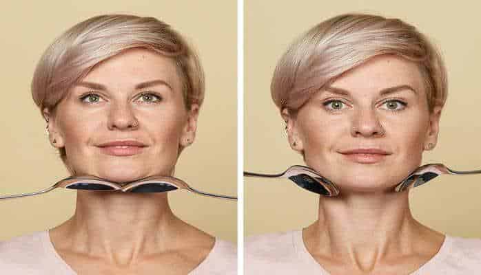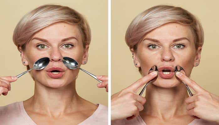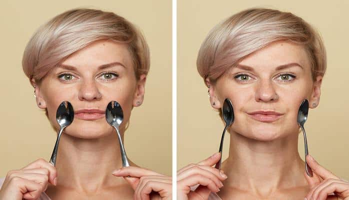İsti qaşıqları ağız kənarlarına yerləşdirin və dik tutun. Dairəvi hərəkətlərlə qaşıqları qulaqlara tərəf gətirin. Sonra qaşıqları təkrar isidin, başlanğıc vəziyyətinə gəlin, ağzınızı yavaşca açın və şəkildəki kimi gülümsəyin. Dairəvi hərəkətlərlə qaşıqları qulaqların altına gətirin. Hər iki məşqi 5-6 dəfə təkrar edin.