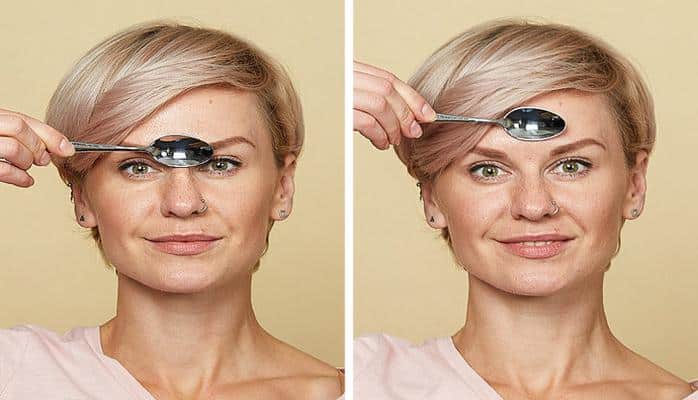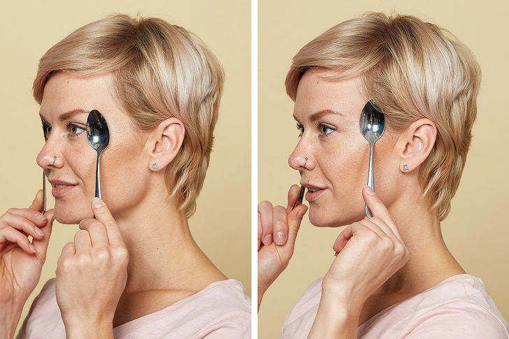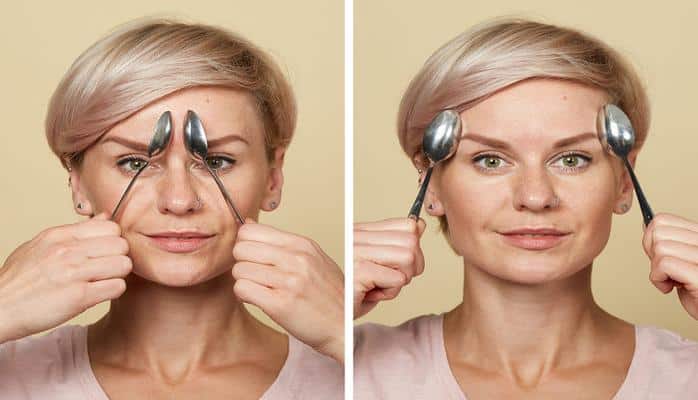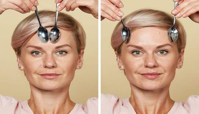 Qaşların arasına bir qaşıq yerləşdirin və yüngülcə basın. Alının üst hissəsinə doğru qalxın. İlıq qaşıq istifadə edərək eyni hərəkətləri təkrar edin.