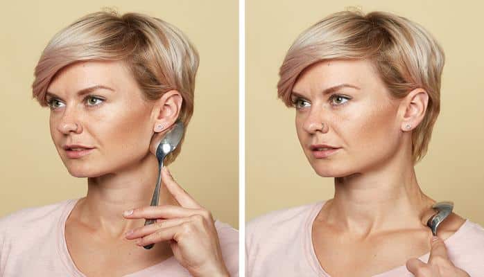 2 ilıq qaşığı çənənin altına yerləşdirin və xəfifcə dairəvi hərəkətlərlə qulağınıza tərəf gətirin. 10 dəfə təkrar edin.