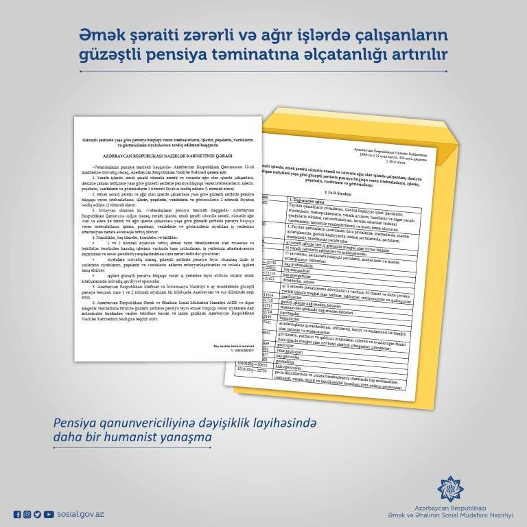 Qeyd edək ki, güzəştli şərtlərlə yaşa görə pensiya hüququ verən istehsalatların, işlərin, peşələrin, vəzifələrin və göstəricilərin siyahıları Nazirlər Kabineti tərəfindən təsdiqlənir. Əmək şəraiti xüsusilə zərərli və ağır olan işlər də həmin siyahı əsasında müəyyən olunur.