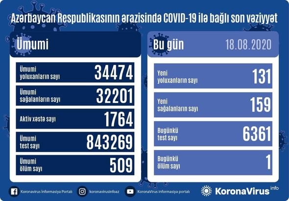 Azərbaycan Respublikasında koronavirus (COVID-19) infeksiyasına 131 yeni yoluxma faktı qeydə alınıb, 159 nəfər müalicə olunaraq sağalıb və evə buraxılıb.