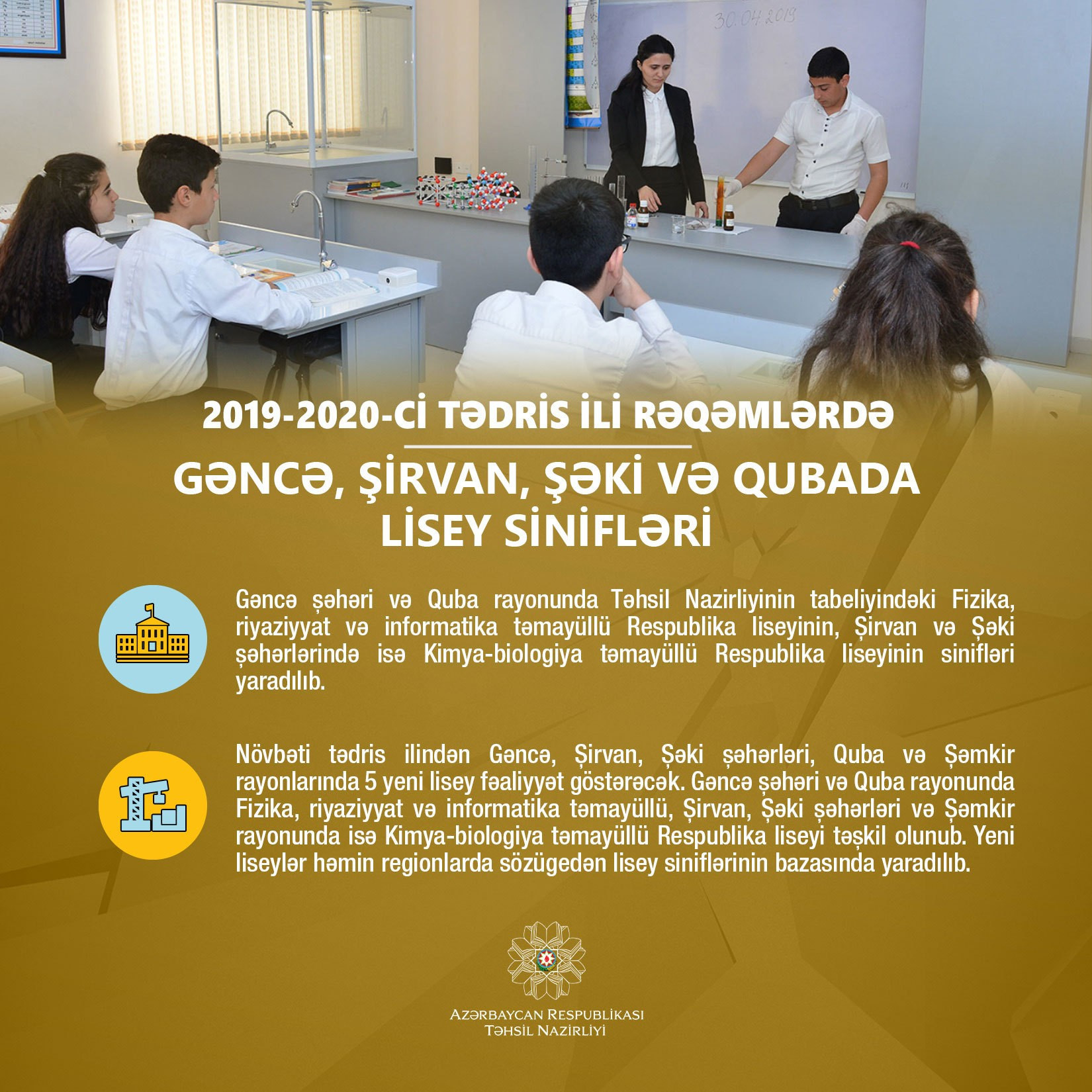 Növbəti tədris ilindən Gəncə, Şirvan, Şəki şəhərləri, Quba və Şəmkir rayonlarında 5 yeni lisey fəaliyyət göstərəcək. Belə ki, Gəncə şəhəri və Quba rayonunda Fizika, riyaziyyat və informatika təmayüllü, Şirvan, Şəki şəhərləri və Şəmkir rayonunda isə Kimya-biologiya təmayüllü Respublika liseyi təşkil olunub. Yeni liseylər həmin regionlarda sözügedən lisey siniflərinin bazasında yaradılıb.