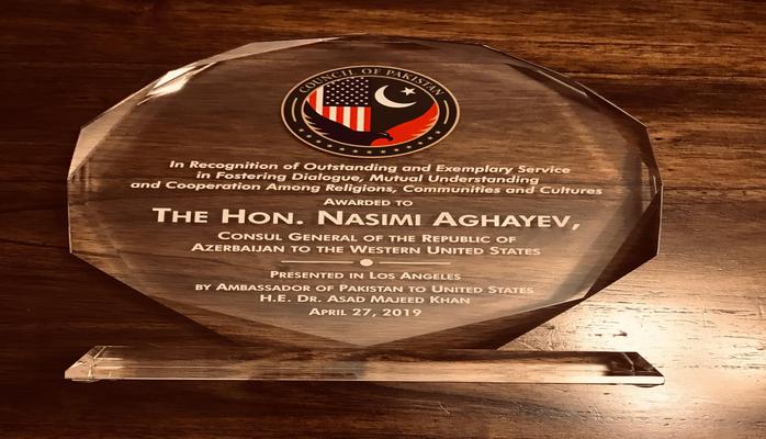 ABŞ-dakı Pakistan icmasının ən nüfuzlu təşkilatlarından olan Pakistan Şurası (Council of Pakistan) Azərbaycanın Los Ancelesdəki baş konsulu Nəsimi Ağayevi öz ali mükafatı ilə təltif edib.
