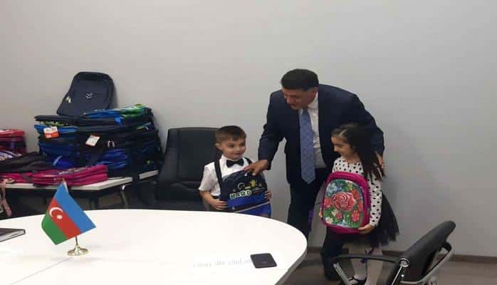 Çıxışdan sonra paytaxtın 11 inzibati rayonundan gəlmiş və ilk dəfə məktəbə gedəcək uşaqlara məktəbli çantası və ləvazimatları hədiyyə verilib.