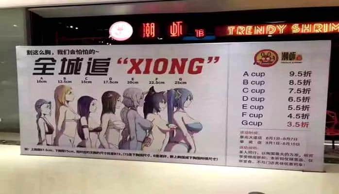 Xançjou çin şəhərinin kənarında yerləşən Trendy Shrimp restoranında bunun çoxlarını maraqlandıracağını fikirləşdilər. Avqust ayının 1-dən buraya bunu nümayiş etdirən banner yerləşdirdilər. Bu bannerdə ziyarət edən qızların hansı endirimi əldə edəcəyi haqda məlumat əks olunub. Ən böyük ölçülü sinəyə sahib olanlara 65, ən kiçiklərinə isə 5 faiz endirim təklif olunur.