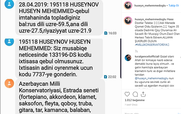 Bu barədə Hüseyn instaqram səhifəsində məlumat verib. 35 yaşlı musiqiçi Azərbaycan Milli Konservatoriyasının estrada sənəti fakültəsinə daxil olub.