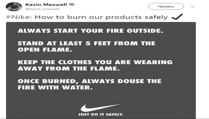 Nike, “Məhsullarımızı təhlükəsiz şəkildə necə yandıra bilərsiniz” başlığı ilə bir növ təlimat xarakterli paylaşımında məhsullarının açıq havada yandırılmasının zəruri olması, məshullar yanıb qutardıqdan sonra atəşin su ilə söndürməli olması kimi nüansları qeyd edib.