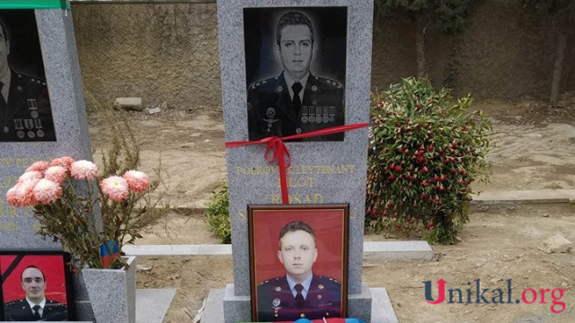 Unikal.org xəbər verir ki, pilotun məzarı üzərinə fotosu qoyulub, sinə daşı Azərbaycan bayrağı ilə örtülüb.