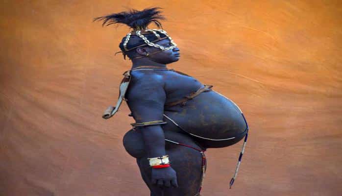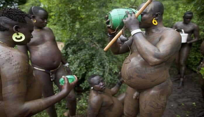 Bayram günü kişilər öz bədənlərini rəngləyir, başlarını lələk və balıqqulağı ilə sarıyır, sinəsinə boyunbağı asır, iplər bağlayaraq bayram keçirilən yerə gedir. Yol onlar üçün asan olmur – az hərəkətli həyat tərzi və çəki artırma izsiz qalmır. Lakin bu qəbilənin ən kök kişişi ciddi üstünlüklər bəxş edir.