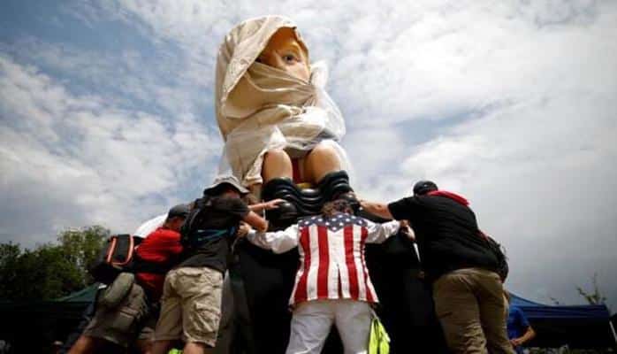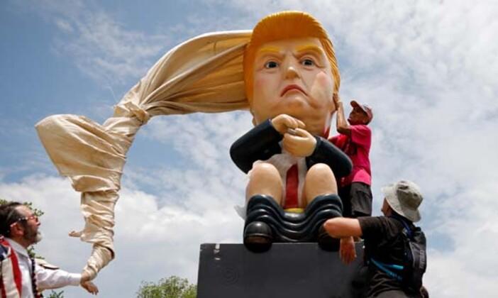 Paytaxtın digər tərəfində isə ABŞ prezidentinə qarşı etiraz aksiyası təşkil olunub. Onlarla qadın əlində mobil telefon tutuan, uşaq bezi geyinmiş nəhəng Tramp şarını havaya qaldırıb. Vaşinqton polisi helium şarlarına qadağa qoyduğu üçün Tramp şari yerə bağlanıb. Etirazlarda Ağ Ev qarşısında bir nəfər Amerika bayrağını yandırmağa cəhd göstərib. Polis həmin şəxsi həbs edib.