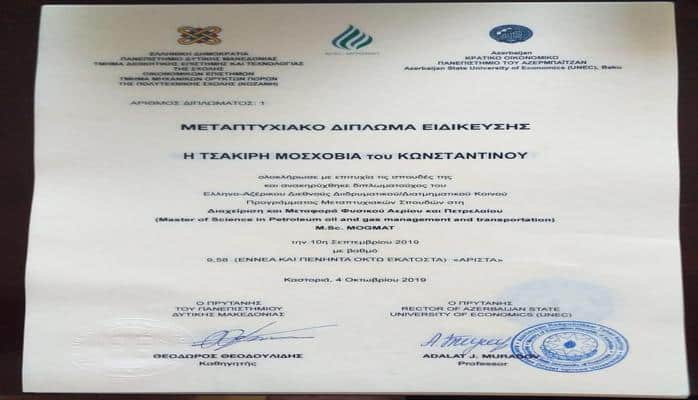 UNEC-in rektoru, professor Ədalət Muradov və Qərbi Makedoniya Universitetinin rektoru, professor Theodoros Theodoulids tərəfindən imzalanan birgə diplomlar Yunanıstan vətəndaşı olan 34 magistr məzuna təqdim edilib.
