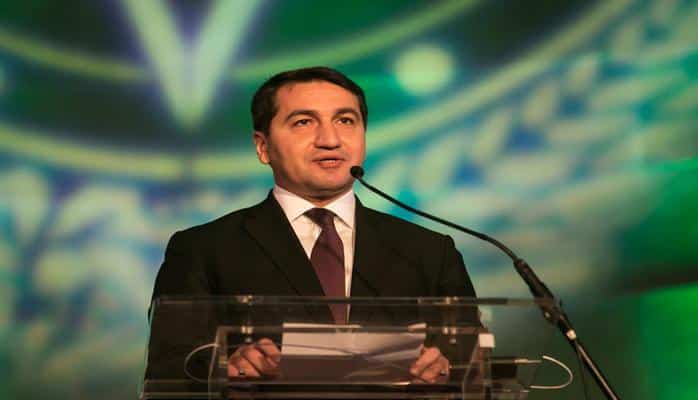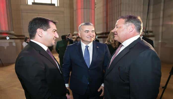 Daha sonra ziyafətdə əsas natiq qismində çıxış edən və hal-hazırda ABŞ paytaxtında işgüzar səfərdə olan Azərbaycan Respublikası Prezidenti Administrasiyasının Xarici siyasət şöbəsinin müdiri Hikmət Hacıyev öz çıxışında Azərbaycan Xalq Cümhuriyyətinin müsəlman şərqində ilk respublika olduğunu, bu Respublikanın irsi əsasında hazırda Azərbaycanın Prezident İlham Əliyevin liderliyi ilə dinamik inkişaf etdiyin vurğuladı və Azərbaycan Xalq Cümhuriyyətinin yaradıcılarının Azərbaycanın bu günki nailiyyətləri ilə fəxr edə biləcəyinə dair ölkə başçımızın fikrini səsləndirdi. Hazırda Azərbaycanın ABŞ-ın etibarlı və strateji tərəfdaşı olduğunu qeyd edən H.Haciyev ölkəmizin əsgərlərinin beynəlxalq sülhə töhfə verdiklərini və amerikan əsgərləri ilə çiyin-çiyinə xidmət apardıqlarını vurğuladı. H.Hacıyev Azərbaycanın Diplomatik Xidmətin 100 illiyi ilə bağlı da öz təbriklərini çatdırdı.