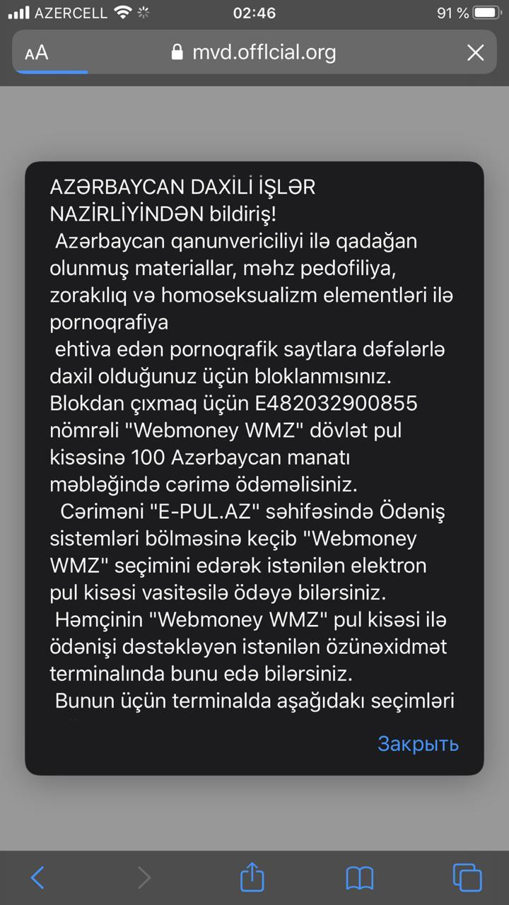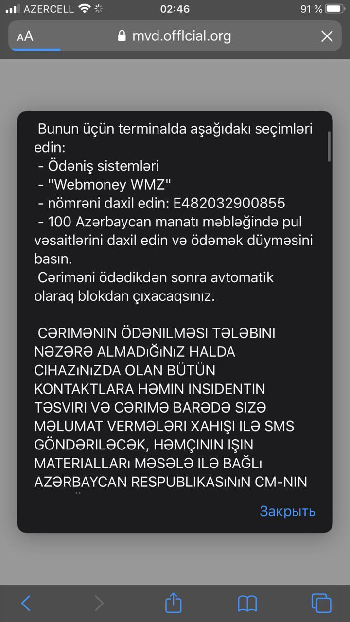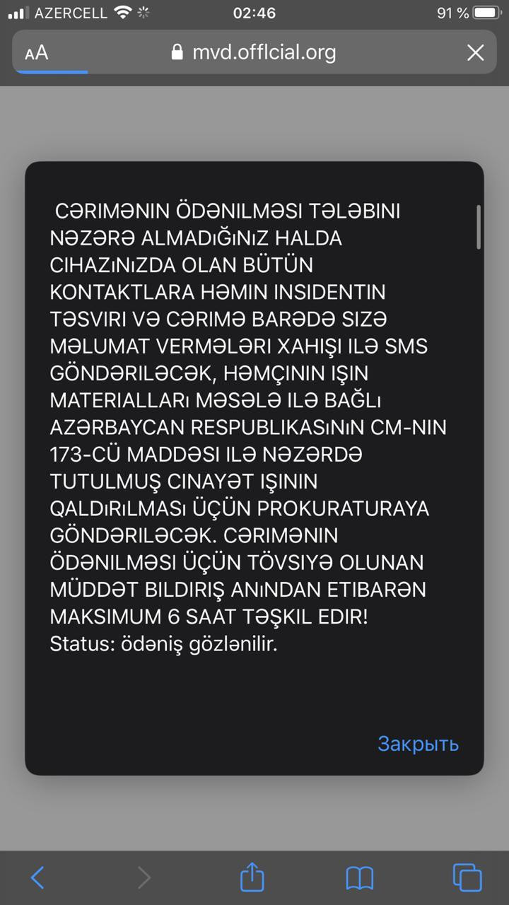 "Cərimənin ödənilməsi tələbini nəzərə almadığınız halda, cihazınızda olan bütün kontaktlara həmin insidentin təsviri və və cərimə barədə sizə məlumat vermələri xahişi ilə SMS göndəriləcək” şəklində yazılan şantaj mətnində cinayət işi başlanacağı barədə də hədə yer alır.