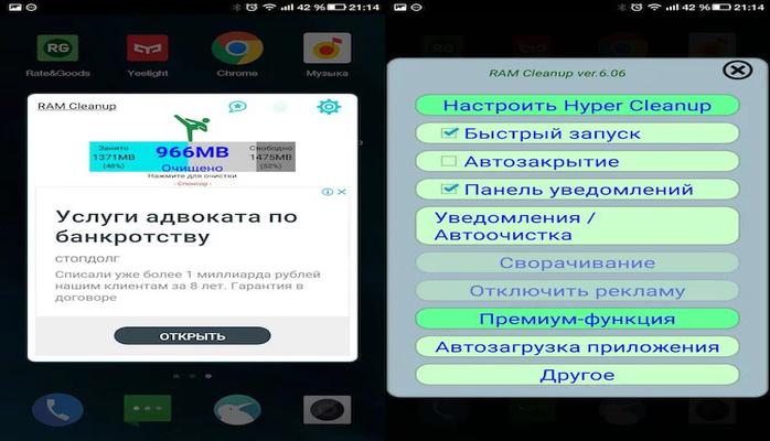 Следующим шагом будет разгон оперативной памяти. Оказывается, она может работать гораздо эффективнее, если ее не засорять ненужными процессами. Вычислить их и «прибить» поможет утилита RAM Cleanup (скачать из Google Play). Она отсканирует смартфон, отыщет нежелательные процессы и позволит остановить их. Это действие освободит несколько сот, а может быть, даже гигабайт ОЗУ, которую вы сможете использовать для более эффективной работы с приложениями.