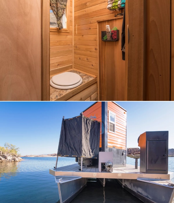 Поскольку в комплектацию кемпере «Ice Castle Fish House не входит душевая, то Скотт Кронк установил его прямо на палубе, огородив лишь водонепроницаемой тканью. А если захочется окунуться в озеро или реку, по которой будет путешествовать, то для удобства (спуска/подъема из воды) мужчина установил специальную лестницу.