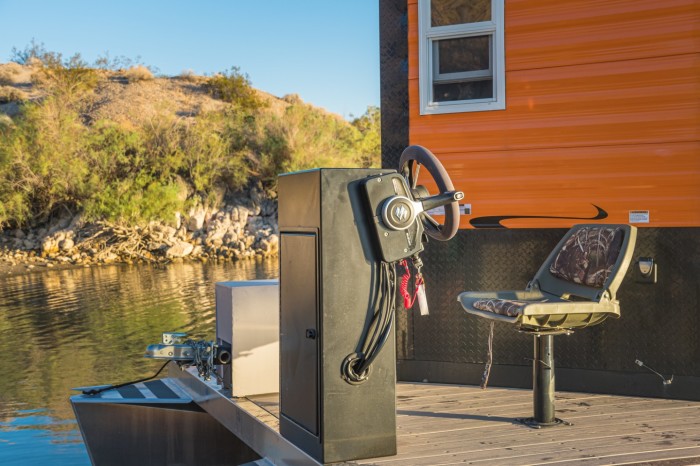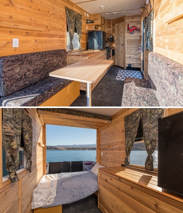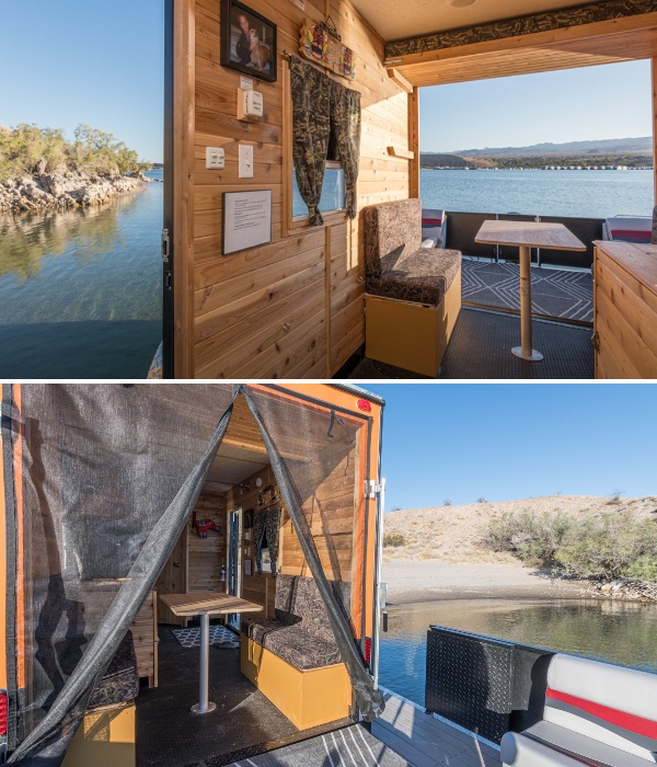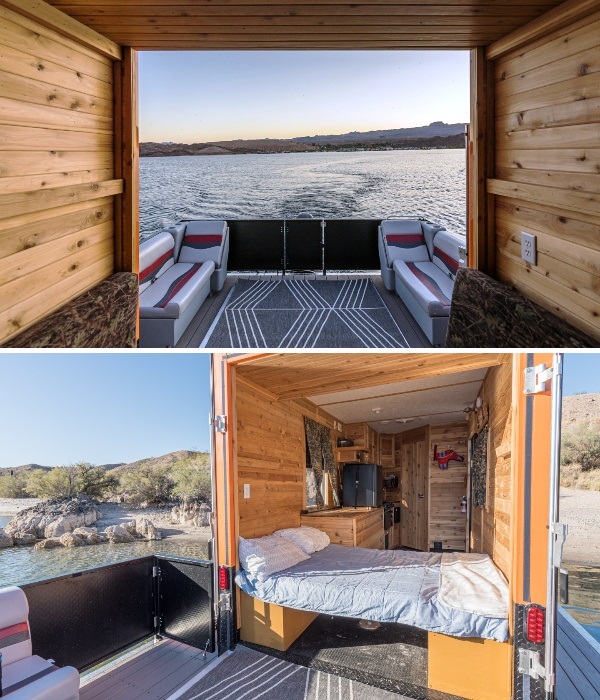 Поскольку домик на колесах является еще и каютой, то изобретательный Скотт заднюю часть кемпера сделал распашной. В течение дня задние двери открываются на понтонную платформу, образуя крытую и открытую зону отдыха, на которой он установил мягкие диваны-трансформеры. В вечернее время или в плохую погоду владелец Heidi-Ho пользуется лишь боковой дверью.