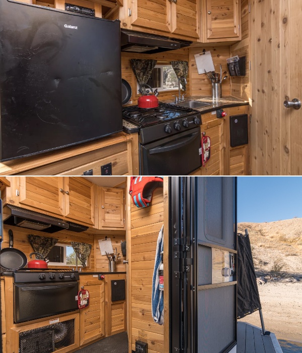 Его внешняя оболочка имеет алюминиевый сайдинг с изоляцией из стекловолокна, которые имеют прекрасные защитные характеристики как от холода, так и от попадания воды внутрь конструкции. Внутри домик довольно комфортный и вместительный. В нем есть полностью обустроенная кухня с мойкой и холодильником, газовая плитой с тремя конфорками и духовкой, также есть небольшая рабочая зона, шкафы и тумбы для хранения.