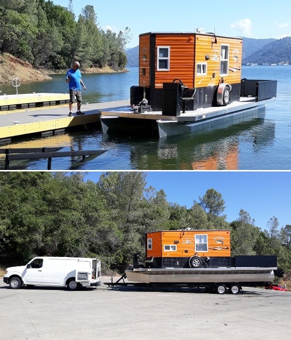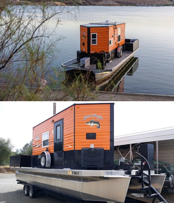 Для того, чтобы иметь комфортную каюту во время плавания на лодку, Скотт Кронк пристроил ...крошечный дом, который можно использовать и самостоятельно, потому что он является полноценной мобильной базой для рыболовов «Ice Castle Fish House». Одноосные домики на колесах разработаны для любителей спортивной рыбалки, именно такую модель автор изобретения взял за основу, потому что она как нельзя лучше подходит для путешествий на воде.