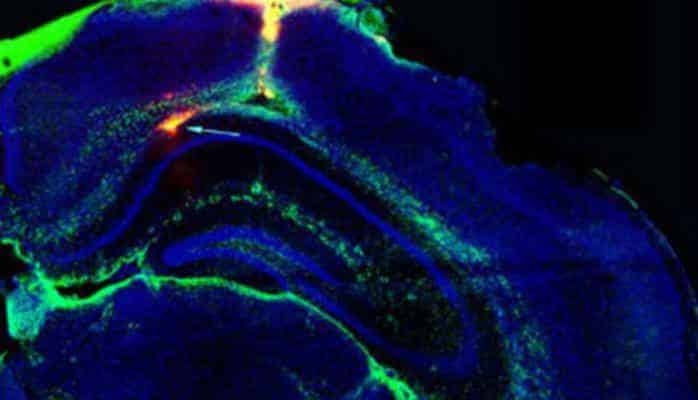 Стрелка указывает на место в гиппокампе мозга мыши, в которое помещен имплант