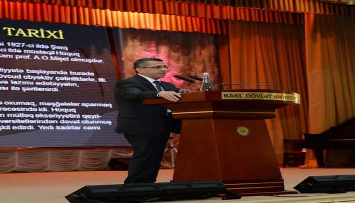 Декан юридического факультета БГУ, профессор Амир Алиев выступил с докладом на тему «Деятельность юридического факультета». Он рассказал об истории и этапах развития факультета. Было отмечено, что юридический факультет был создан в 1927 году как отделение факультета востоковедения Азербайджанского государственного университета (ныне БГУ), а в 1928 году отделение трансформировалось в независимый юридический факультет. Блестящий период истории юридического факультета связан с именем общенационального лидера Гейдара Алиева.