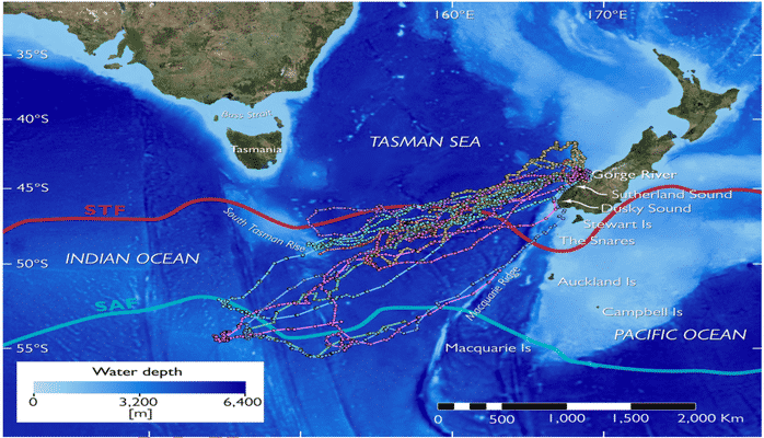На карте видно, что птицы двигаются, как правило, на юго-запад и кормятся в двух районах: либо к югу от Тасмании, либо в районе Антарктики. Ученые отмечают, что пингвины, которые раньше уплывали из мест гнездования, направлялись к ближнему району возле субтропического фронта и могли «сэкономить» при этом около 750 километров. А вот те птицы, что были вынуждены задержаться в гнездах из-за птенцов, потом почему-то плыли быстрее и дальше — к отдаленным субантарктическим районам.