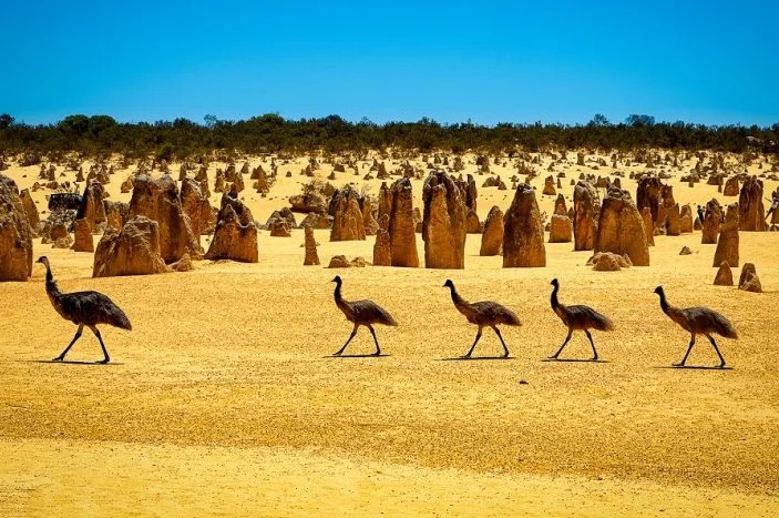 Особенно впечатляющая картина ждет вас в Западной Австралии: здесь бесчисленные колонны из известняка образуют целую армию. Колонны имеют высоту до четырех метров и некоторым из них до 500 000 лет. В пустыне Пиннаклс также велики шансы встретить серых кенгуру, эму или какаду.