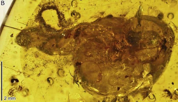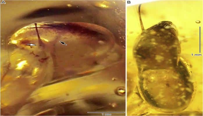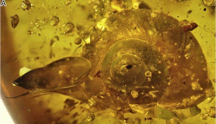 Учёные изучили уникальную окаменелость, купленную у коллекционера в 2016 году: в куске бирманского янтаря возрастом 99 миллионов лет была заключена улитка. Возраст находки определяли радиоизотопным анализом и биостратиграфическими методами (по аммонитам и пыльце).