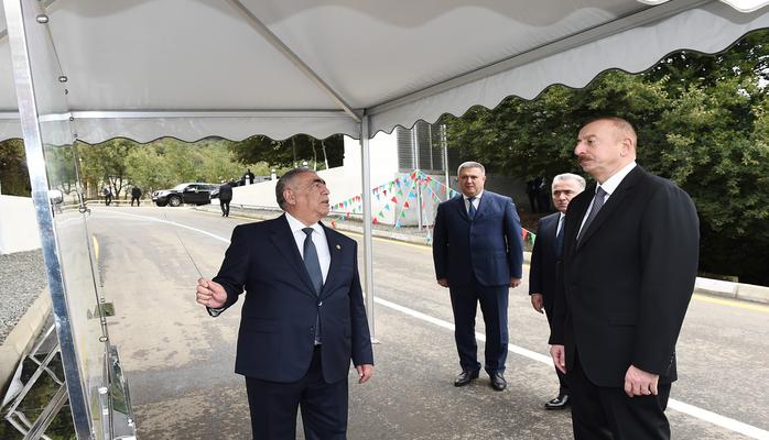 Президент Ильхам Алиев разрезал ленту, символизирующую открытие новой дороги.