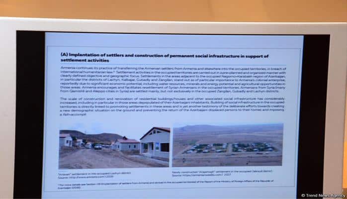 В свою очередь Набиев добавил, что оккупированные территории безжалостно разрушены. Он подчеркнул, что леса, уничтоженные за последние несколько лет в Нагорном Карабахе, составляют пять процентов всего лесного фонда Азербайджана. Глава АО "AzərKosmos" добавил, что на оккупированных азербайджанских территориях строятся новые поселки, в которые незаконно заселяются армяне. По его словам, на оккупированных территориях Азербайджана армяне разрушили исторические и культурные памятники, и на снимках спутника видны следы разрушенных памятников. Также Набиев отметил, что армяне занимаются незаконной сельскохозяйственной деятельностью на оккупированных азербайджанских территориях.