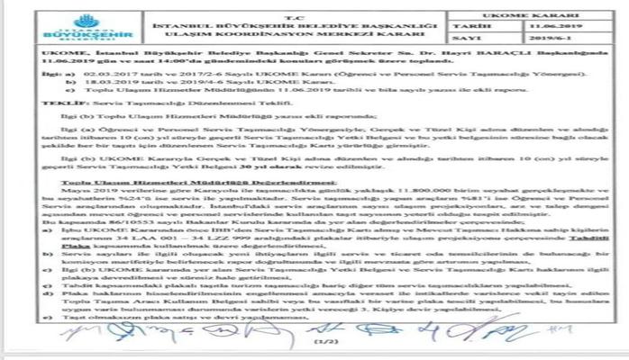 İstanbul Büyükşehir Belediyesi'nin yapmış olduğu araştırmalarda kullanılan mevcut öğrenci ve personel servis sayısının yeterli olduğu tespit edildi. Buna dayanarak UKOME, İBB'den daha önce Servis Taşımacılığı Kartı almış ve Mevcut Taşımacı Hakkı'na sahip kişilere tahditli plaka verdi.