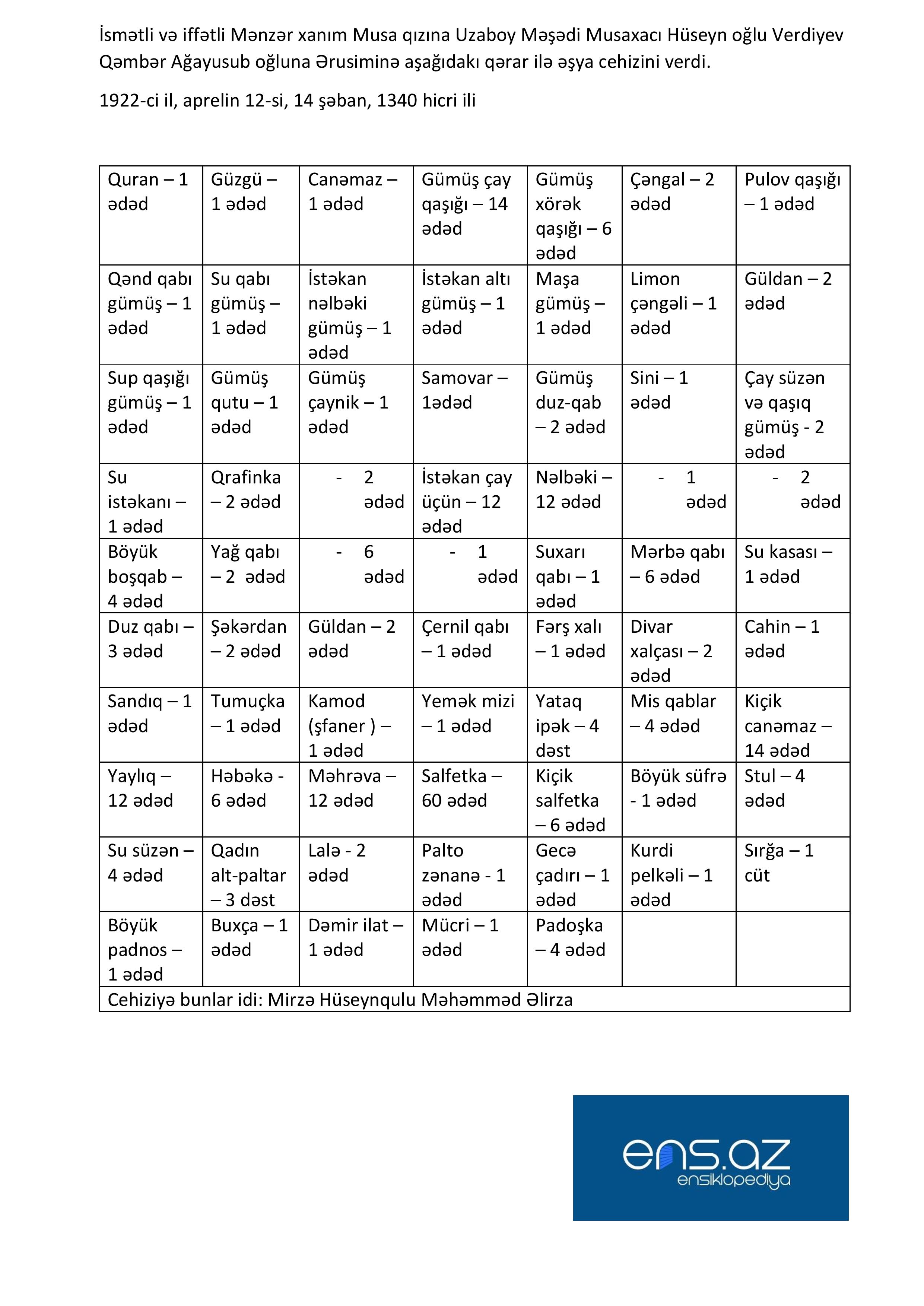 100 il əvvəl Gəncənin Ozan məhəlləsində bax bu şəkildəki evi tikdirən Məşədi Musa Hacı Hüseyin oğlu tərəfindən qızı Mənzər xanımın Verdiyev Qəmbər Ağayusub oğlu ilə toyu münasibətilə cehiz verilməsi haqqında tərtib etdirdiyi şəhadətnamə.
