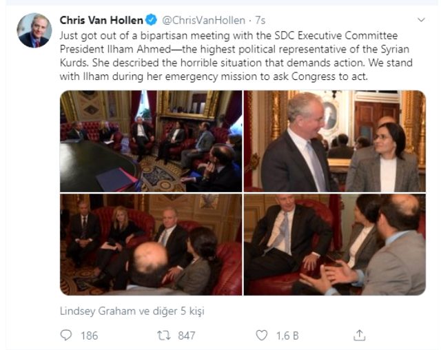 Görüş barədə məlumatı Hollen öz tvitter mikrobloqunda yayıb. Əhmədi Suriya kürdlərinin ən yüksək səviyyəli təmsilçisi olaraq tanıdan Van Hollen “İlham Əhmədlə toplantımızdan sonra şimal-qərbi Suriyada yaranan vəziyyətlə bağlı daha çox narahatıq. Konqres elə indi kifayət qədər amerikalı əsgərlərin Suriyada qalmağını təmin etməli, hava əməliyyatını sığortalamalı və Türkiyəyə qarşı sanksiya tətbiq etmək üçün bir araya gəlməlidir” ifadələrini işlədib.