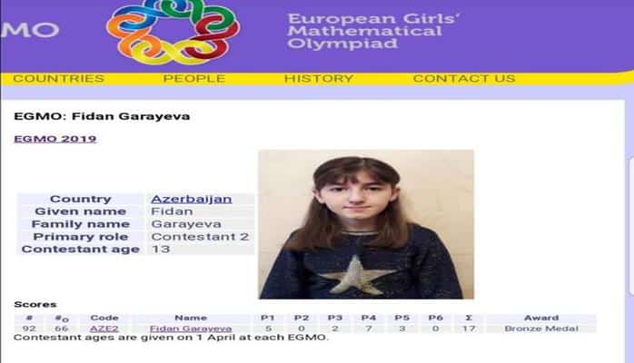 Azərbaycandan olan 13 yaşlı Fidan Qarayeva beynəlxalq riyaziyyat yarışması olan “Avropalı Qızların Riyaziyyat Olimpiadası”nda (European Girls' Mathematical Olympiad) üçüncü yeri tutub və bürünc medal qazanıb.