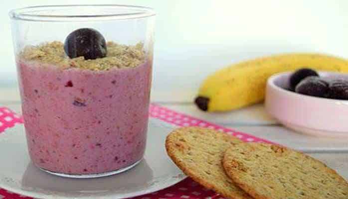 Bananın qabıqlarını soyun və soyuducuda dondurun. Donduqdan sonra çıxarın və dondurulmuş vişnə, labne və süd ilə birlikdə blenderdə əzin. Süfrəyə təqdim edəcəyiniz şüşə qəliblərə alınan qarışığı doldurun və üzərinə əlinizlə ovduğunuz peçenye parçalarını əlavə edin. Üzərinə meyvə parçaları əlavə edərək də təqdim edə bilərsiniz.