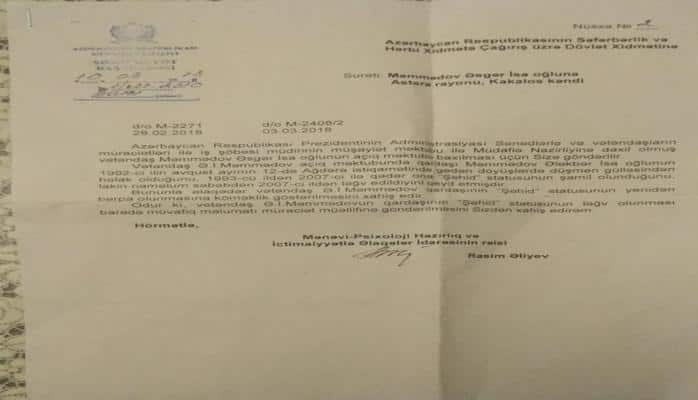 Sorğuya cavab olaraq bildirilib ki, müraciətdə qeyd edilən məsələ ilə əlaqədar vətəndaş Əsgər Məmmədova 09.03.2018-ci il tarixli 594 nömrəli məktubla ətraflı cavab verilib. Bildiririk ki, “Şəhid adının əbədiləşdirilməsi və şəhid ailələrinə edilən güzəştlərin tətbiqi qaydaları”nın təsdiq edilməsi barədə Azərbaycan Respublikası Nazirlər Kabinetinin 15 yanvar 1994-cü il tarixli 10 saylı Qərarının 1.2.5-ci yarımbəndinə əsasən, Azərbaycan Respublikasının ərazi bütövlüyü uğrunda aparılan hərbi əməliyyatlar zamanı həlak olmuş və itkin düşmüş hərbi qulluqçular şəhid hesab edilirlər.
