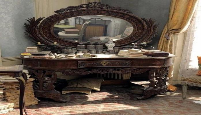 Əl işi olan, o dövrün tualet masasında bir çox kosmetik qutu dururdu, saçlar üçün şotkalar, zəngli saat... Bütün bunlar toz və torla örtülmüşdü.