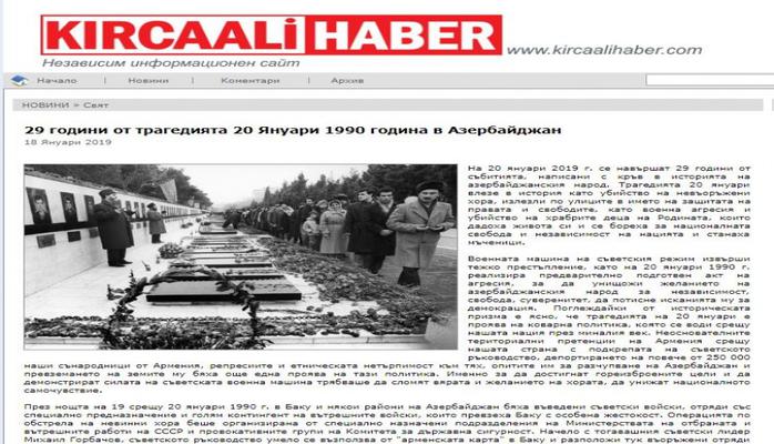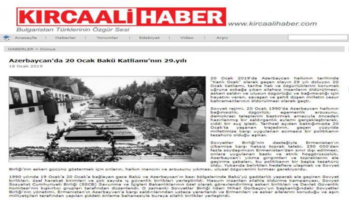 “Kırcaalihaber”onlayn qəzetində bolqar dilində “Azərbaycanda 1990-cı ilin 20 Yanvar faciəsindən 29 il ötür” və türk dilində “Azərbaycanda 20 yanvar 1990-cı il Bakı qətliamının 29-cu ili” başlıqlı xəbərlər dərc olunub. Xəbərlərdə 20 Yanvar faciəsinin ötən əsr boyu xalqımıza qarşı yürüdülmüş məkrli siyasətin növbəti təzahürü olduğu vurğulanıb. Bildirilib ki, sovet rəhbərliyinin himayədarlığı ilə Ermənistanın ölkəmizə qarşı başladığı əsassız ərazi iddiaları, 250 mindən artıq soydaşımızın Ermənistan ərazisindəki əzəli torpaqlarından qovulması, onlara qarşı repressiya və etnik dözümsüzlük, Azərbaycanı parçalamaq və torpaqlarını zəbt etmək təşəbbüsləri bu siyasətin təzahürü olub. Qəzet qanlı hadisələr zamanı Azərbaycan xalqının igid övladlarının əsl fədakarlıq və qəhrəmanlıq nümunəsi göstərərək, milli ideallar uğrunda birləşdiklərini və sovet hərbçilərinin təcavüzünə qətiyyətlə sinə gəldiklərini vurğulayıb.