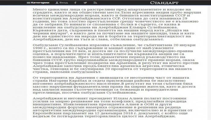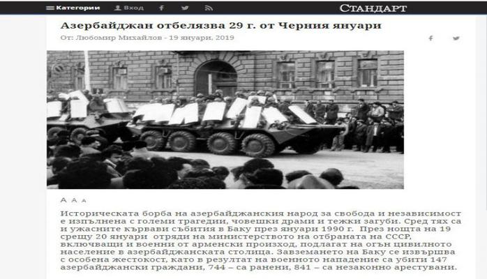 “Standart” qəzetində “Azərbaycan Qara Yanvarın 29-cu ildönümünü qeyd edir” başlığı ilə dərc olunmuş xəbərdə faciə barədə ətraflı məlumat verilməklə yanaşı, əməliyyat zamanı nəinki mülki şəxslərin öldürüldüyü, evlərin və ictimai yerlərin atəşə tutulduğu, hətta təcili yardım maşınlarının tankların altında əzildiyi və yaralılara yardım göstərən tibb işçilərinin güllələndikləri qeyd olunub. Xəbərdə Azərbaycan Respublikasının İnsan Hüquqları üzrə Müvəkkili (Ombudsman) Elmira Süleymanovanın 1990-cı il 20 Yanvar faciəsinin 29-cu ildönümü ilə əlaqədar yaydığı bəyanata istinad olunaraq, hadisələrin hüququ aspektləri barədə məlumat verilib. Xəbərdə Azərbaycan ərazilərinin işğal olunmasına və onun ağır nəticələrinə toxunulub, Azərbaycan tərəfinin Dağlıq Qarabağ münaqişəsinin sülh yolu ilə həllinə mütəmadi olaraq səylər göstərdiyi qeyd edilib. Xəbərdə Azərbaycan Prezidenti İlham Əliyevin münaqişənin sülh yolu ilə həlli üçün dəfələrlə nüfuzlu beynəlxalq qurumların, o cümlədən BMT Baş Məclisinin toplantılarında təşəbbüslər göstərdiyi əks olunub. Həmçinin nüfuzlu beynəlxalq qurumların müvafiq qərarlarında, o cümlədən Avropa Parlamentinin 2018-ci il 12 dekabr tarixli qətnaməsində Azərbaycanın ərazi bütövlüyünün təsbit olunduğu vurğulanıb.