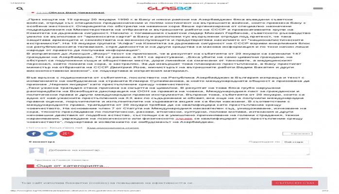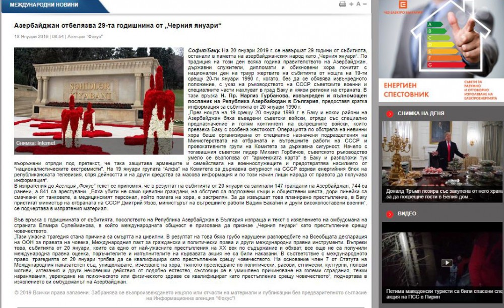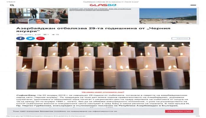 “Fokus” xəbər agentliyi, “Novini24/7” və “Glas.bg” xəbər portallarının internet səhifələrində sovet rejiminin hərb maşının istiqlaliyyət, azadlıq, suverenlik istəyi ilə yaşayan Azərbaycan xalqının iradəsini qırmaq, demokratiya tələblərini boğmaq üçün 1990-cı il yanvarın 20-də qabaqcadan hazırlanmış təcavüzkarlıq aktını həyata keçirərək ağır cinayət törətdiyi bildirilib. Xəbərlərdə faciə nəticəsində BMT-nin Ümumdünya İnsan Hüquqları Bəyannaməsi, “Mülki və siyasi hüquqlar haqqında” Beynəlxalq Pakt və digər beynəlxalq hüquqi sənədlərin kobud şəkildə pozulduğu qeyd olunub. Öz mahiyyəti və miqyasına görə XX əsrdə törədilmiş ən dəhşətli cinayətlərdən olan 20 Yanvar hadisələrinə indiyədək beynəlxalq hüquqi qiymət verilmədiyi, qanlı aksiyanın sifarişçiləri və icraçılarının cəzalandırılmadığı göstərilir.