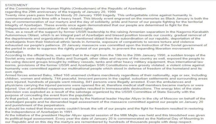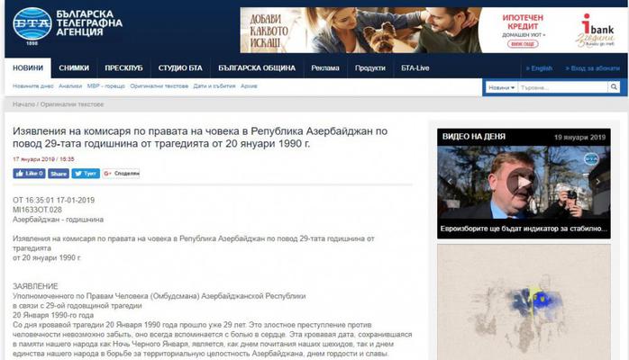 Azərbaycan Respublikasının İnsan Hüquqları üzrə Müvəkkili (Ombudsman) Elmira Süleymanovanın 1990-cı il 20 Yanvar faciəsinin 29-cu ildönümü ilə əlaqədar yaydığı bəyanat Bolqarıstan Teleqraf Agentliyinin internet səhifəsində rus və ingilis dillərində yayımlanıb. Bəyanatda faciə ilə bağlı hərtərəfli məlumat verilməklə onun BMT-nin baş katibinə, BMT-nin Təhlükəsizlik Şurasına, BMT-nin İnsan Hüquqları üzrə Ali Komissarına, BMT-nin Qaçqınlar üzrə Ali Komissarına, BMT-nin İnsan Hüquqları Şurasına, UNICEF-ə, UNESCO-ya, Avropa İttifaqına, Avropa Şurasına, ATƏT-ə, Beynəlxalq və Avropa Ombudsmanlar İnstitutlarına, Asiya Ombudsmanlar Assosiasiyasına, İslam Əməkdaşlıq Təşkilatına və bu quruma üzv dövlətlərin Ombudsmanlar Assosiasiyasına, Avropa Uşaq Hüquqları Ombudsmanları Şəbəkəsinə, Beynəlxalq Sülh Bürosuna, müxtəlif ölkələrin ombudsmanlarına, Azərbaycan Respublikasının xarici ölkələrdəki və xarici ölkələrin respublikamızdakı səfirliklərinə, Azərbaycanın diaspor təşkilatlarına göndərildiyi əksini tapıb.
