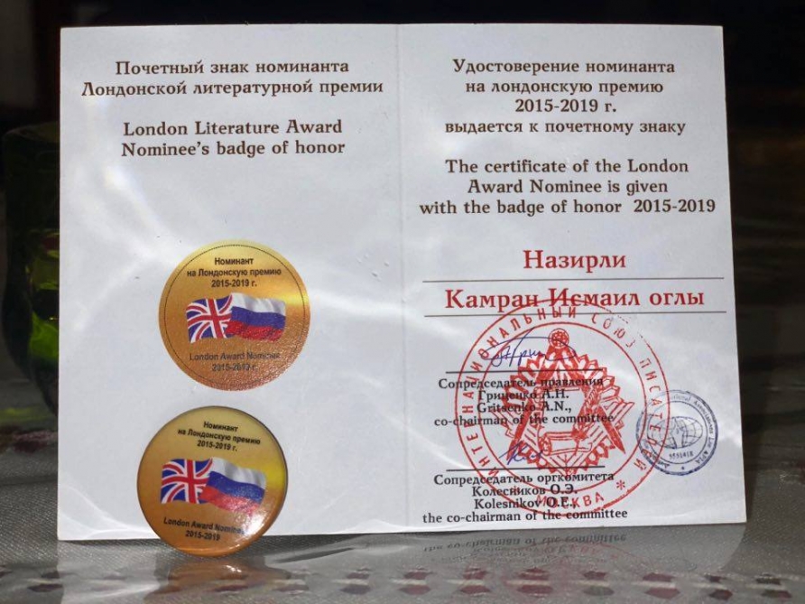Ens.az xəbər verir ki,Azərbaycan yazıçısı Kamran Nəzirli London Ədəbi Mükafatı nominantı olaraq 2015-2019-cu illərin “Ən yaxşı yazıçısı” adına layiq görülüb. SİA-nın məlumatına görə, döş nişanı ilə birlikdə sertifikatı və vəsiqəni, habelə nominant diplomunu Moskva şəhərində yerləşən Beynəlxalq Yazıçılar İttifaqının sədri Aleksandr Qriçenko və Elmi-Fantastik Ədəbiyyat və Kino xadimləri ittifaqının sədri, tərcüməçi Oleq Kolesnikov imzalayıblar. Qəbul olunmuş standartlara görə, bu mükafat üzrə nominantların hamısı “İlin ən yaxşı yazıçısı” titulunu da qazanırlar. Bundan başqa, Azərbaycan yazıçısı Beynəlxalq Yazıçılar Təşkilatına həqiqi üzv kimi qəbul olunub.