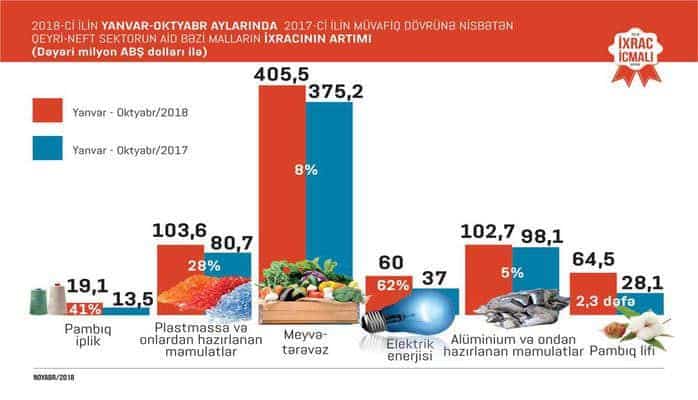 Fins.az məlumat verir ki, İqtisadi İslahatların Təhlili və Kommunikasiya Mərkəzinin “İxrac İcmalı”nın 2018-ci ilin noyabr ayı üçün yayımladığı məlumatlarda Azərbaycandan xarici ölkələrə ixrac olunan bəzi məsulların artım faizi açıqlanıb.Təqdim olunan məlumatlarda plastmassa və onlardan hazırlanan məmulatlarda ötən ilin eyni dövrü ilə müqaisədə 28% artım olduğu göstərilib.
