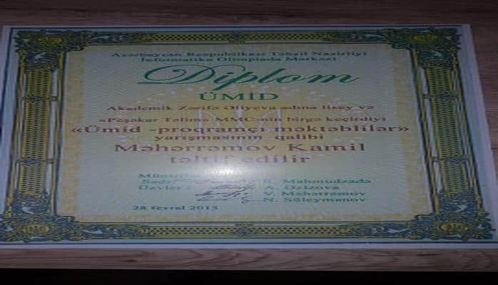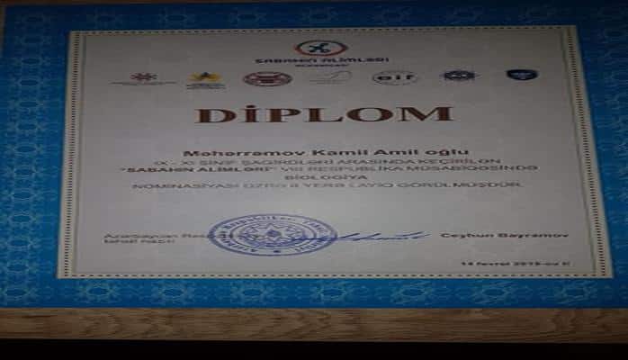 XI sinifdə Biologiya üzrə iştirak etdiyim müsabiqədə II yerə layiq görüldüm.Yeganə azərbaycanlı şagirdəm ki, 6 fənn üzrə olimpiadalarda ilk üçlüyə daxil olmuşam”.