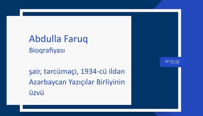 Abdulla Faruq - şair, tərcüməçi, 1934-cü ildən Azərbaycan Yazıçılar Birliyinin üzvü