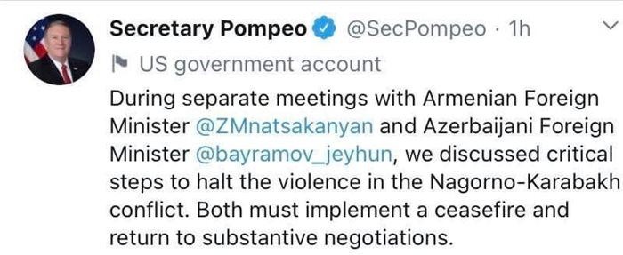 "Bu gün Ermənistan Xarici İşlər naziri Zohrab Mnatsakanyan və Azərbaycan Xarici İşlər naziri Ceyhun Bayramovla keçirilən ayrı- ayrı görüşlərdə Dağlıq Qarabağ münaqişəsində zorakılığın dayandırılması üçün kritik addımları müzakirə etdik. Hər iki tərəf atəşkəsi tətbiq etməli və substantiv (ikitərəfli) danışıqlara qayıtmalıdırlar", - deyə Pompeo qeyd edib.